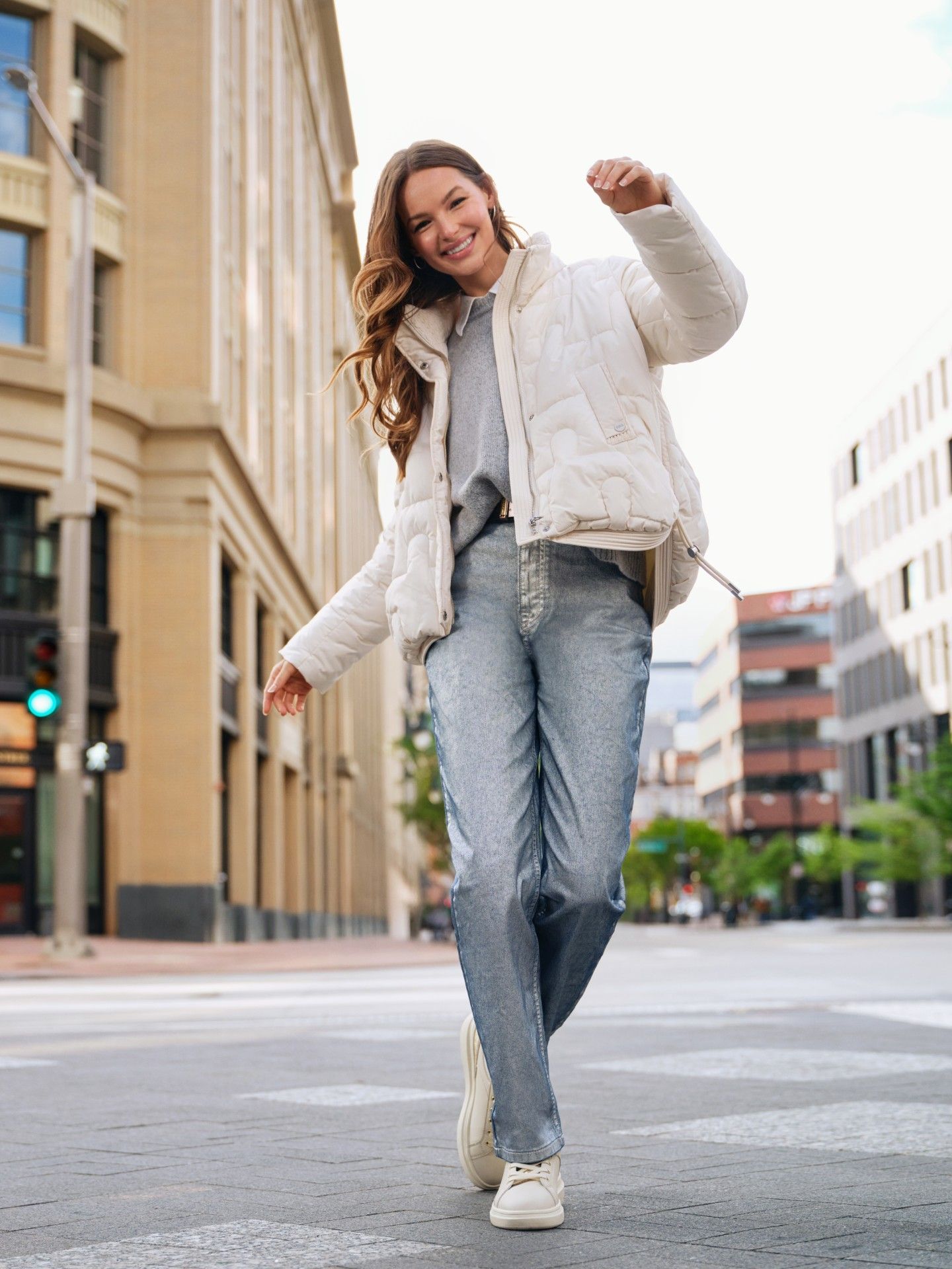 U ženskoj kolekciji ističu se traperice s efektom srebrnog laka, koje su pravi izbor za one koje žele zasjati tijekom blagdana. Tu su i kaputi, stisnuti u struku i s visokim ovratnikom, koji spajaju glamur i funkcionalnost. Kombinacija ružičastih i krem tonova unosi nježnost i toplinu u zimske gradske dane.