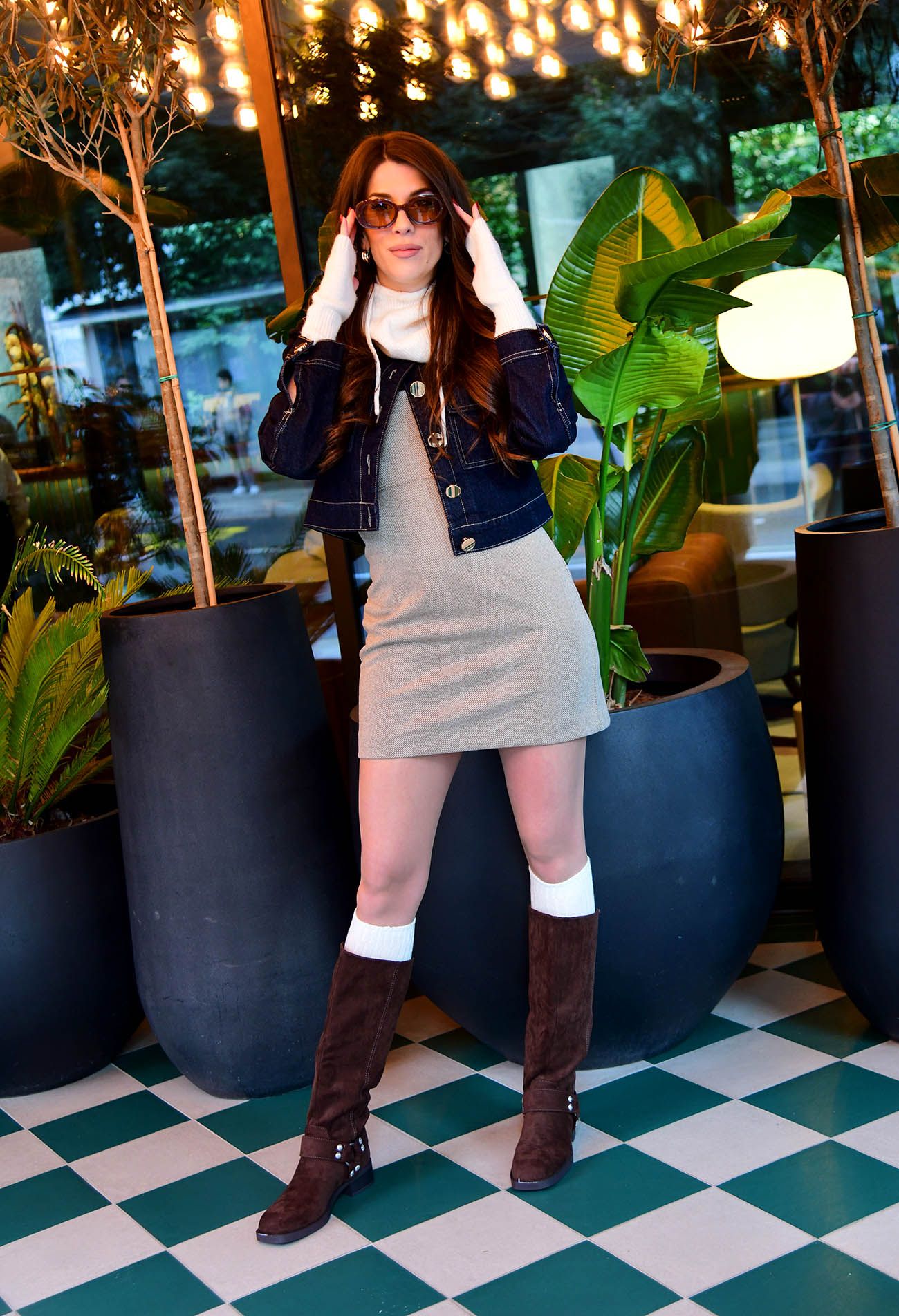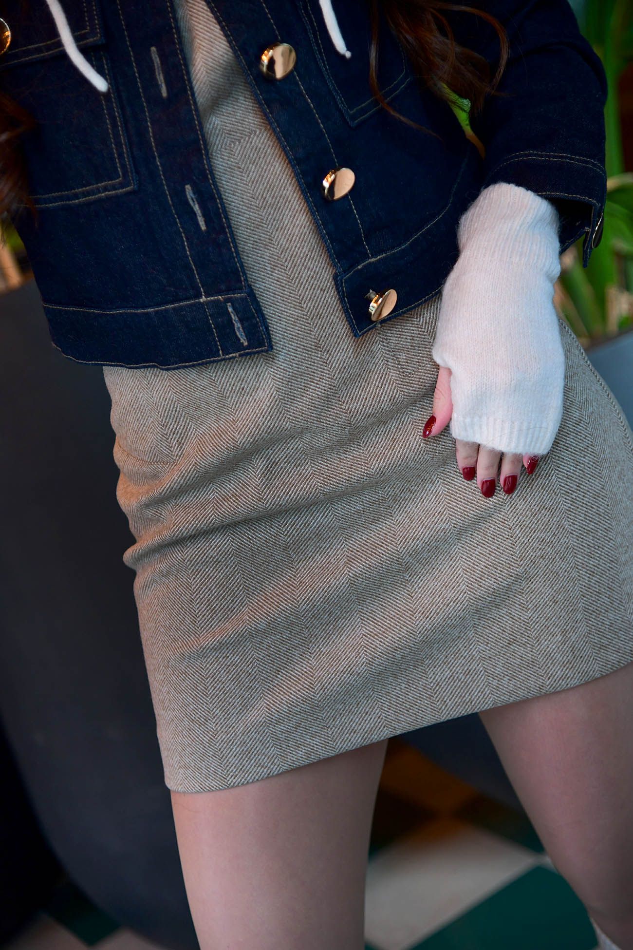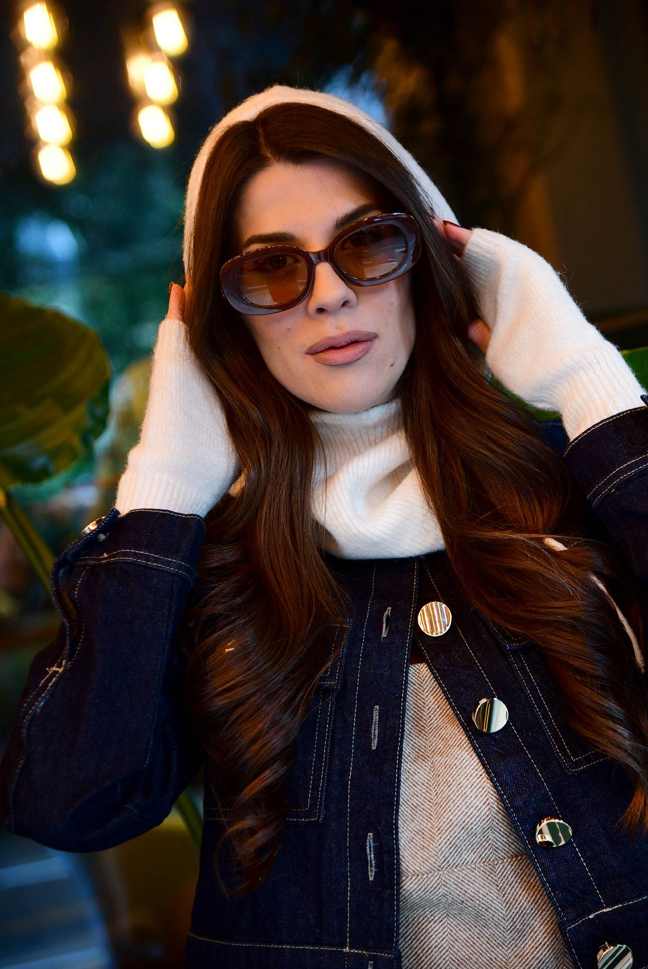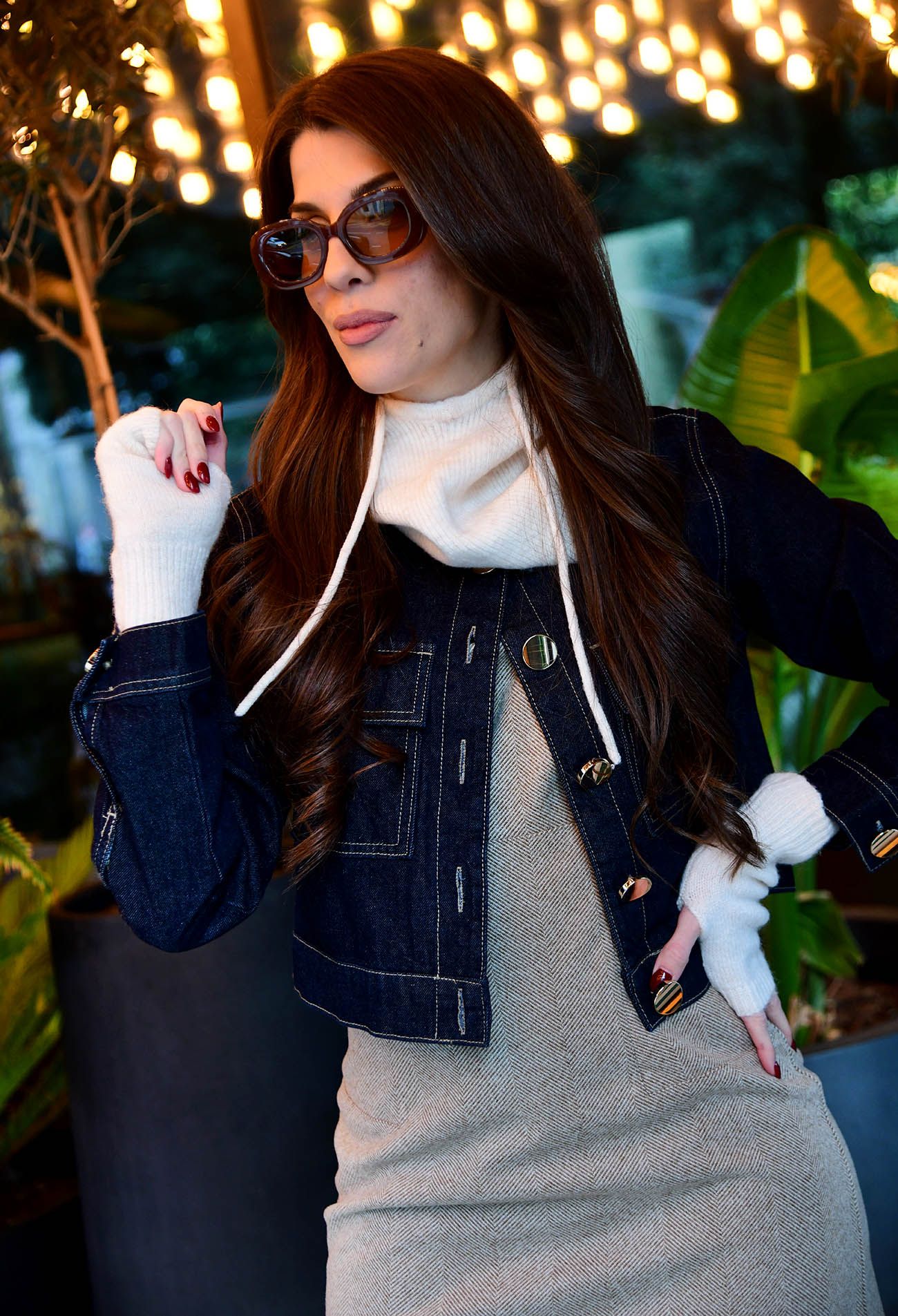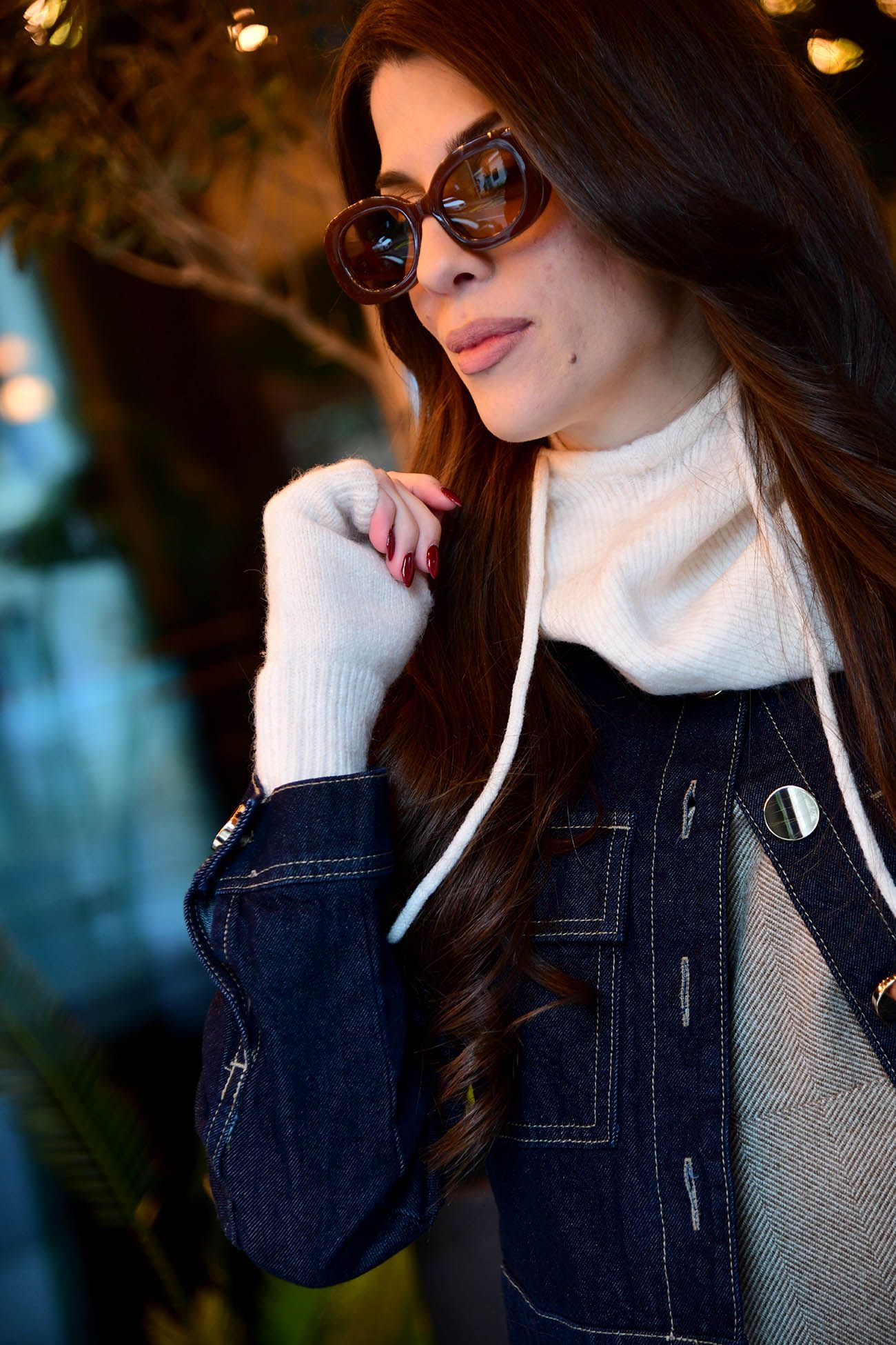 Smeđa boja je vladarica sezone. Stoga smo u styling uključili visoke čizme od brušene kože, koje su došle do izražaja s kul dokoljenkama. Traper jakna na haljinu u boji bijele kave fantastično su upotpunili trendy detalji. Posebno izdvajamo šal s kapuljačom ili tzv. “balaklava” koja je trenutno hit na modnoj sceni.