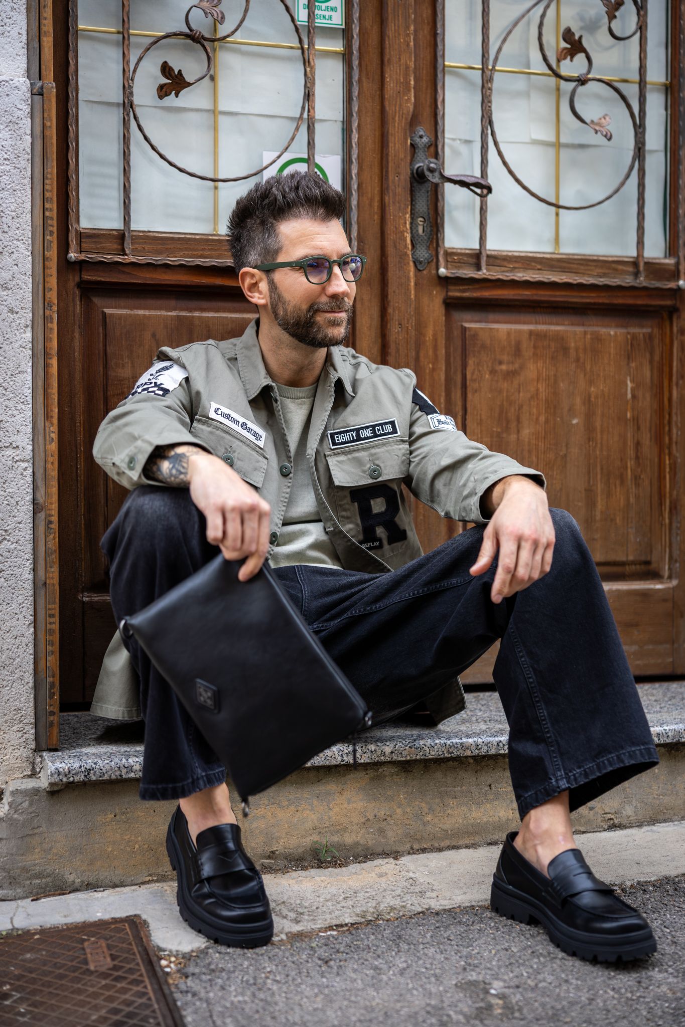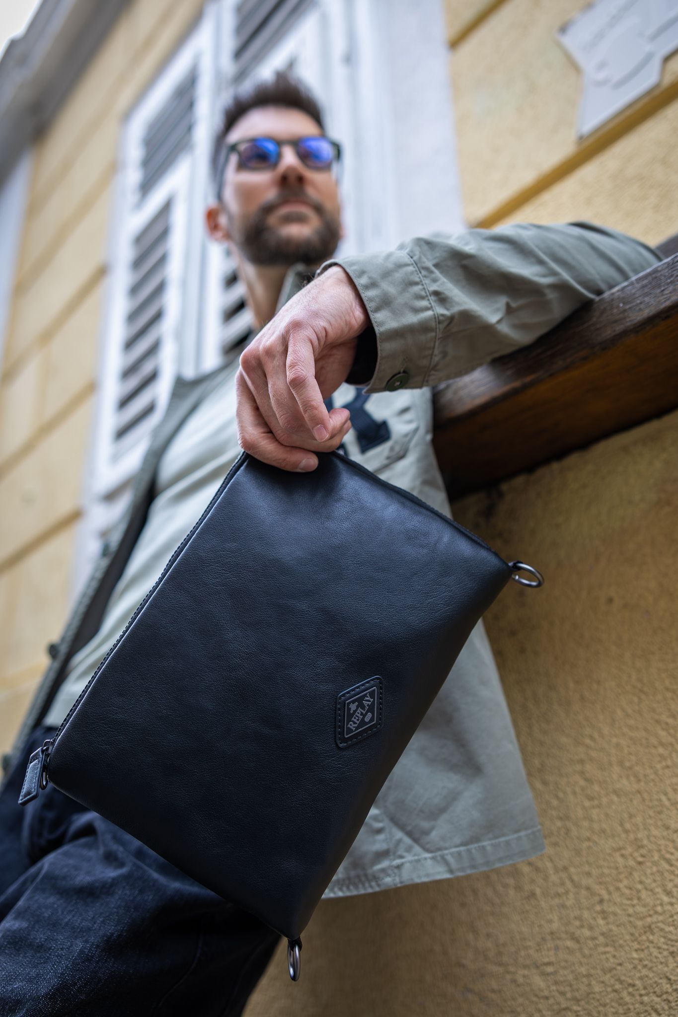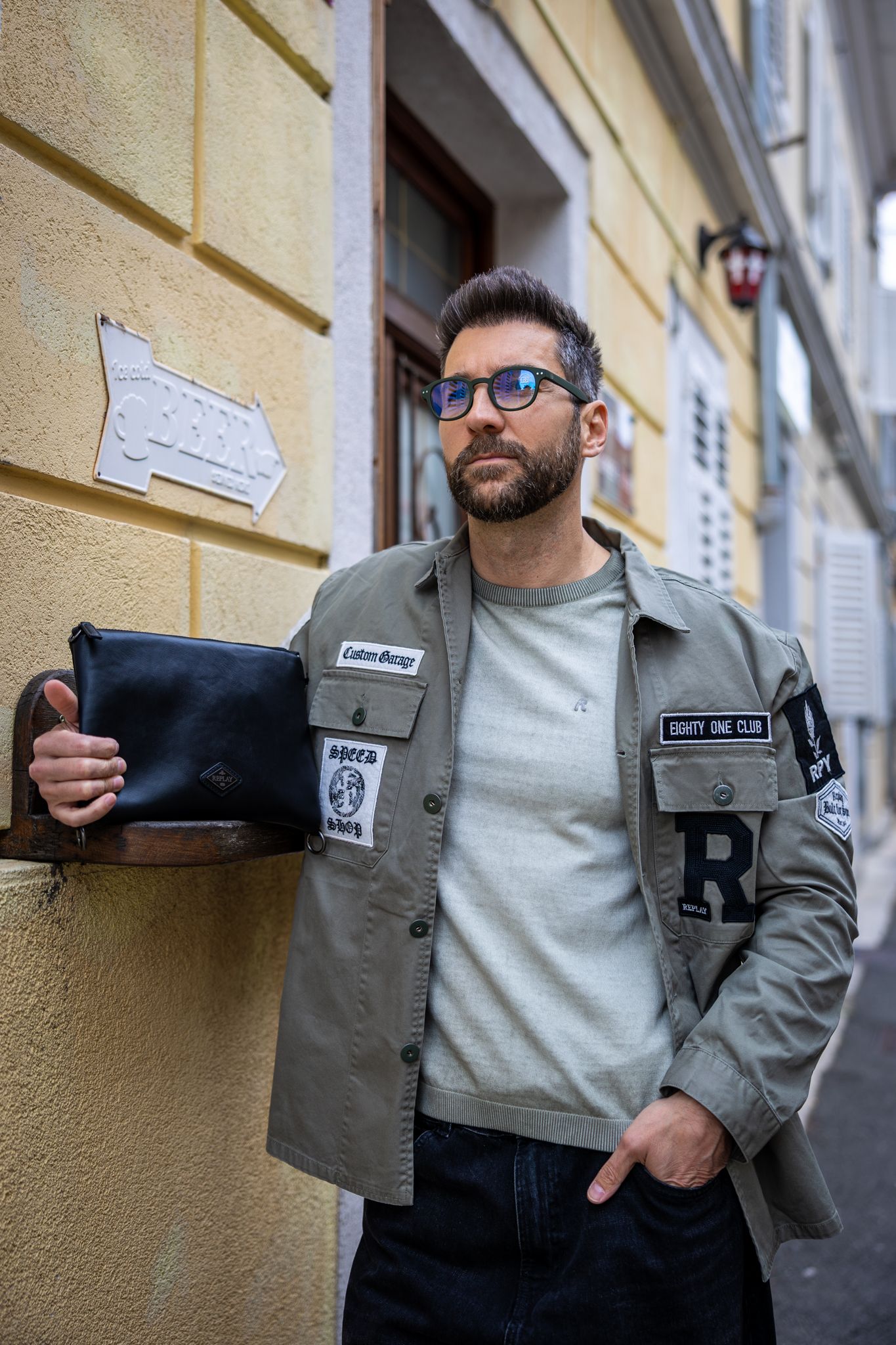 Jakna, Replay 261,00 €. Hlače, Cropp 32,99 €. Majica, Replay 104,00 €. Torba, Replay 72,00 €. Naočale, IZIPIZI 41,00 €