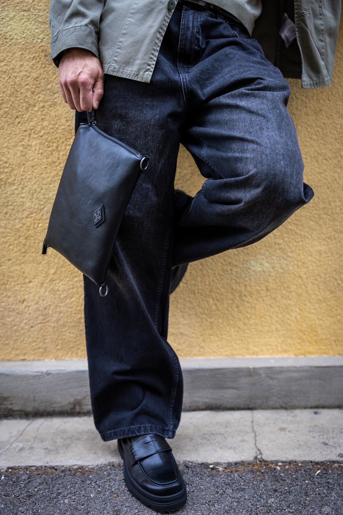 Široke tamne traperice unose retro vibru inspiriranu devedesetima, ali u modernoj interpretaciji. Krojem pružaju udobnost i nonšalantnost, a istovremeno grade snažnu siluetu. Cjelinu zaokružuju robusne crne loaferice s debelim potplatom – ključni komad koji balansira između klasične elegancije i suvremenog street stila.