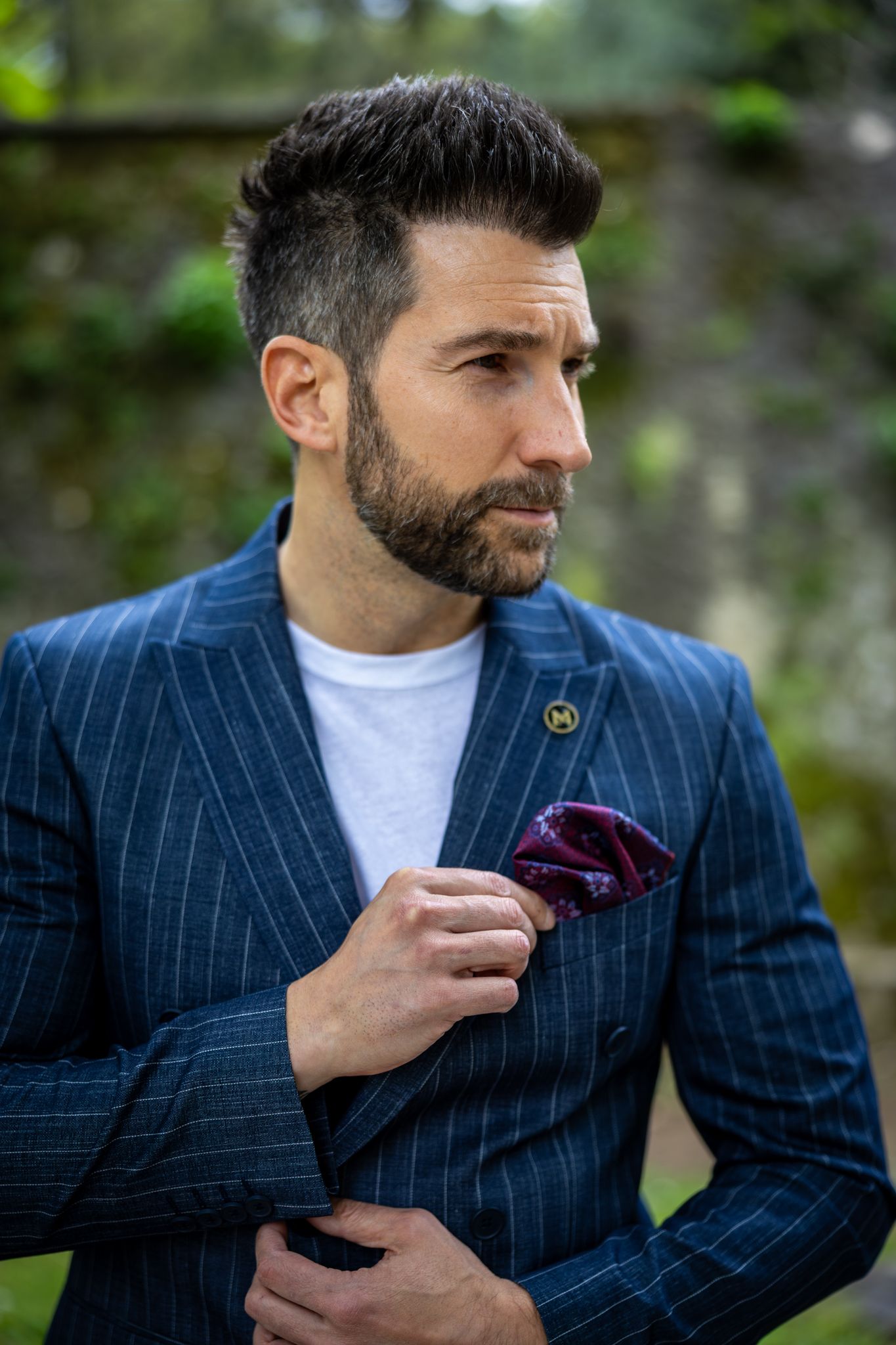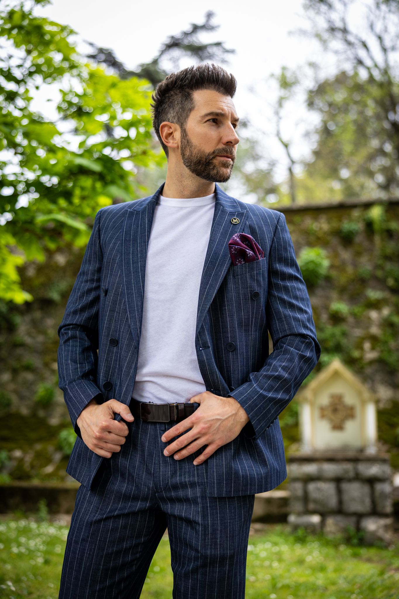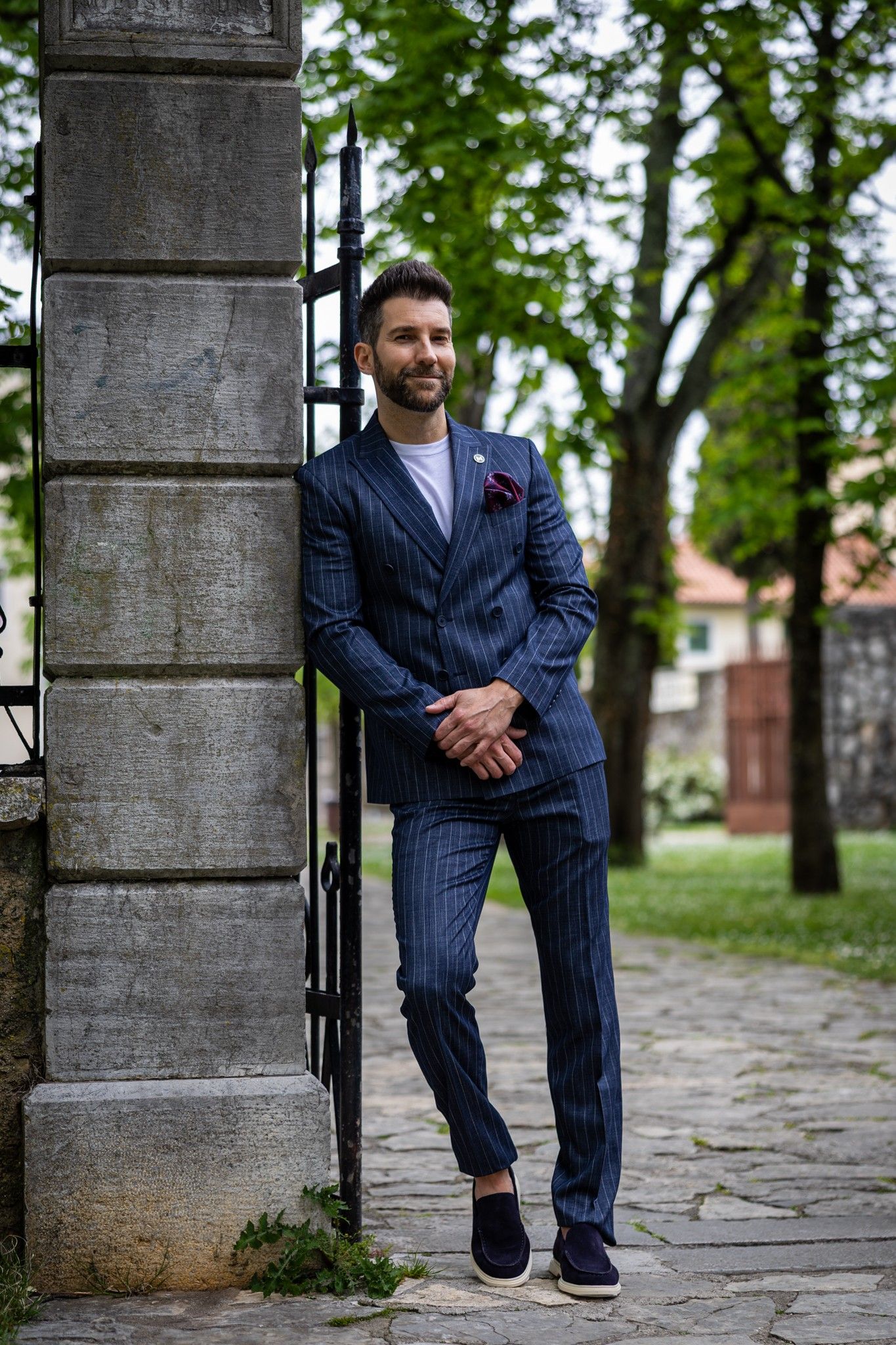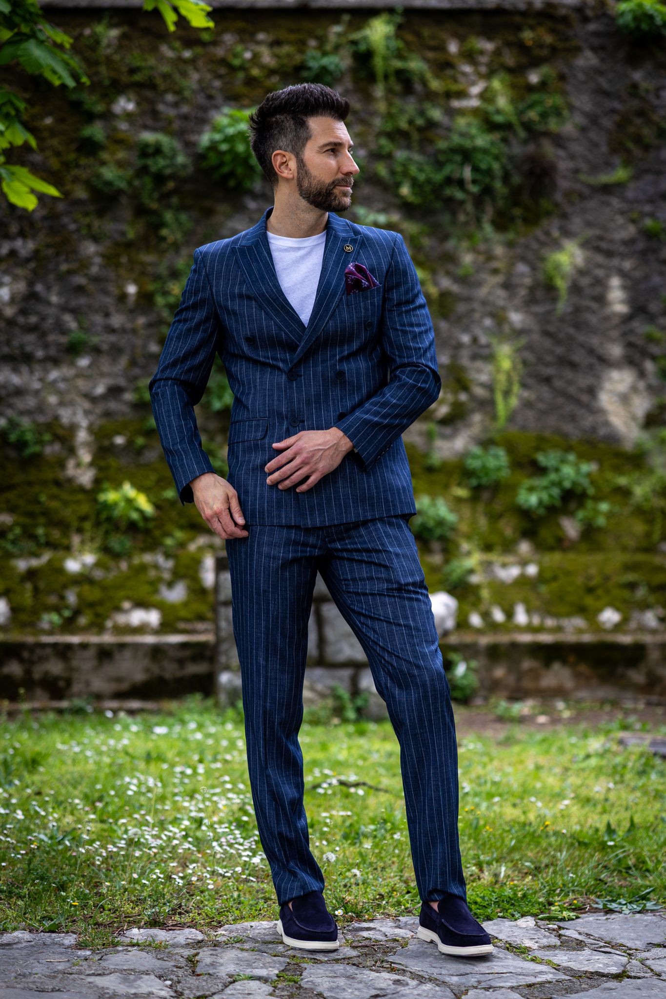 Ovaj outfit igra na kartu klasične elegancije, ali bez imalo krutosti. Ključni komad – tamnoplavo odijelo s prugama i dvorednim kopčanjem – vraća nas u zlatno doba muškog kroja, ali u modernoj, slim-fit interpretaciji. Upravo takva odijela danas dominiraju jer uspješno spajaju tradicionalni tailoring s aktualnim siluetama koje prate liniju tijela .