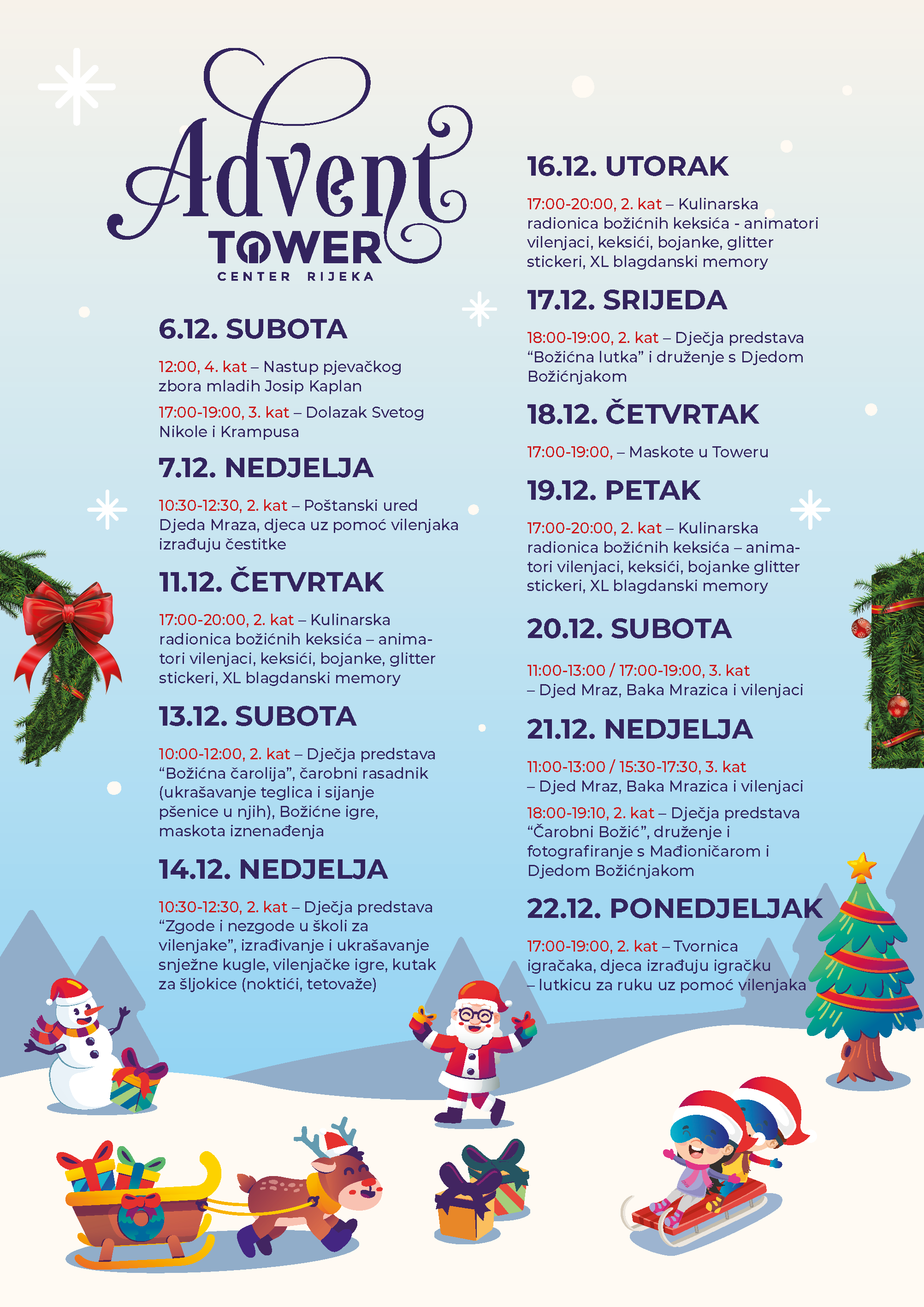 Tower ove godine donosi raskošan program prepun veselja, kreativnosti i nezaboravnih trenutaka za cijelu obitelj. U goste nam stižu omiljeni Sveti Nikola i Djed Božićnjak, a atmosferu će dodatno obogatiti zabavni program za najmlađe, čarobne predstave te mnoštvo događanja koja će mališanima izmamiti osmijeh na lice, a odrasle vratiti u najljepše dane djetinjstva.